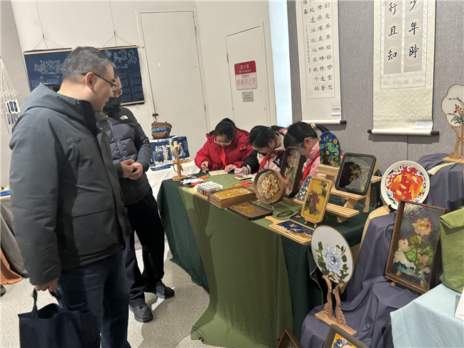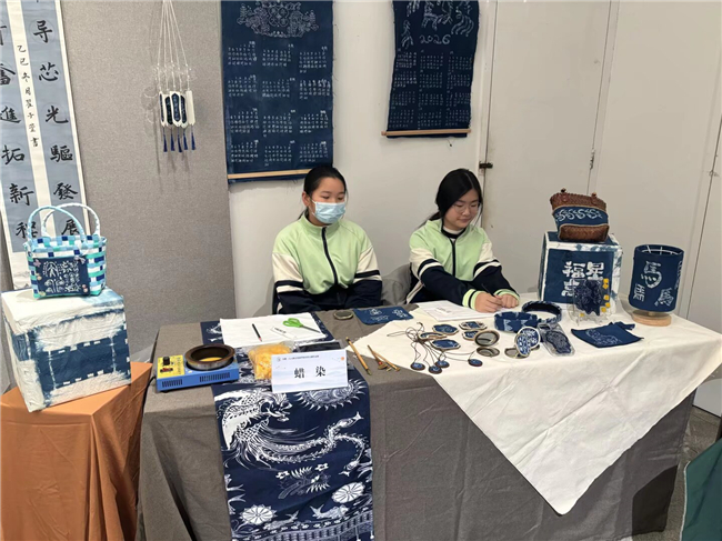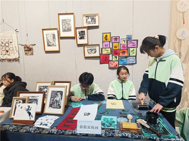 开展当日,我校由焦长俊校长亲自带队,集团三个校区共7位美术教师及8名学生代表共同参与。在社团展演区,我校学生沉稳专注,现场展示了蜡染的斑斓纹样、景泰蓝掐丝珐琅的精巧工艺以及版画拓印的独特魅力,吸引了众多参观者驻足欣赏与交流,其精湛的技艺和专注的态度赢得了现场领导、老师及主办方的一致好评。
