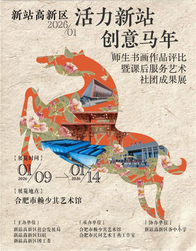 新站高新区“活力新站·创意马年”师生书画作品评比暨课后服务艺术社团成果展已隆重启幕。本次展览汇聚全区众多师生优秀作品与社团实践成果,艺术氛围浓厚,极具观赏与学习价值。诚邀您利用周末时间,带孩子一同前往合肥市赖少其艺术馆参观展览,感受传统与创意碰撞的艺术魅力,共享美育时光。
