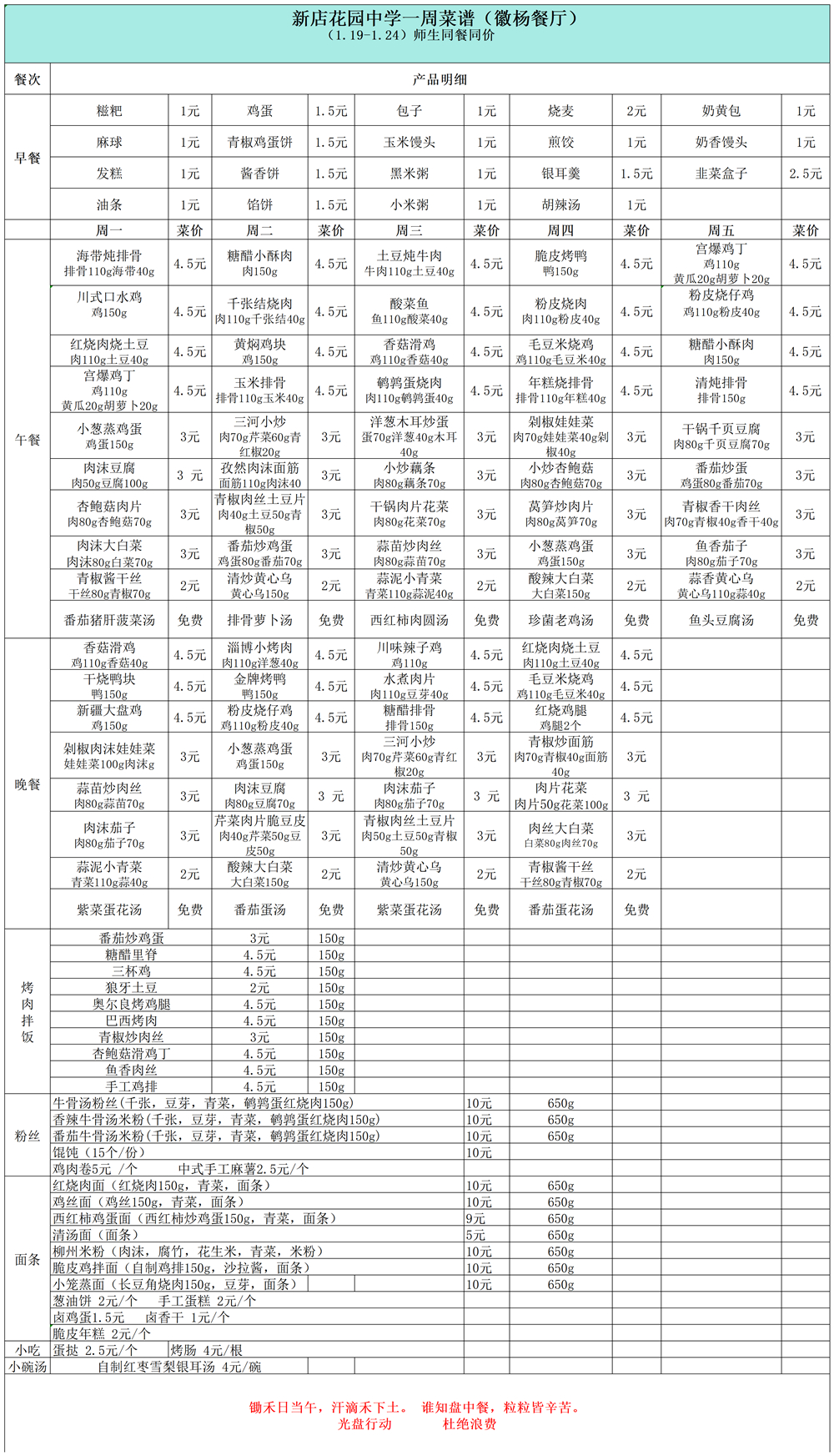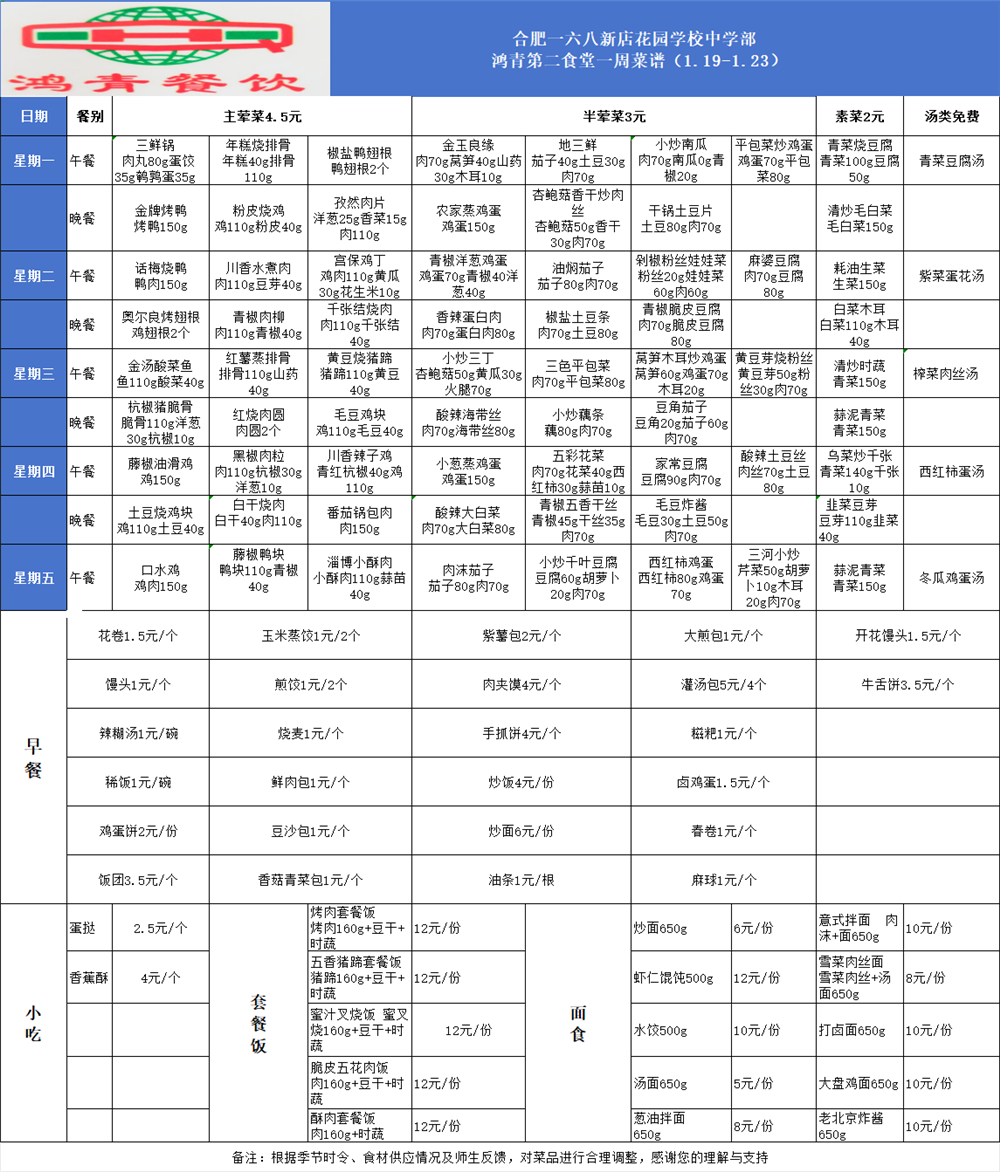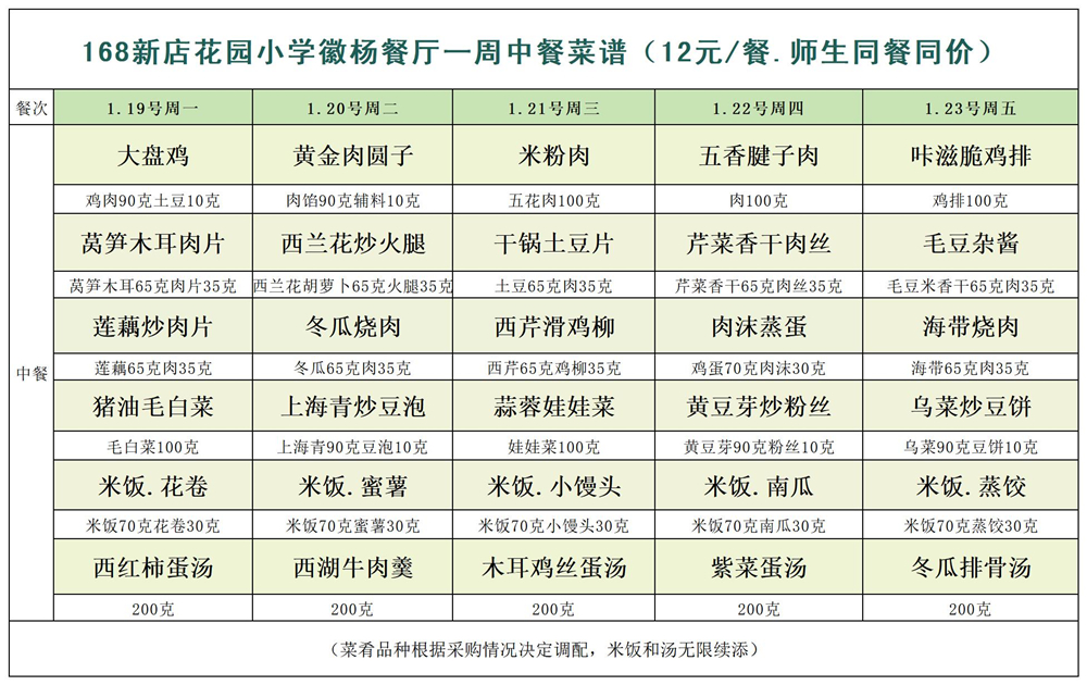 合肥一六八新店花园学校一周菜单(1月19日-1月23日)