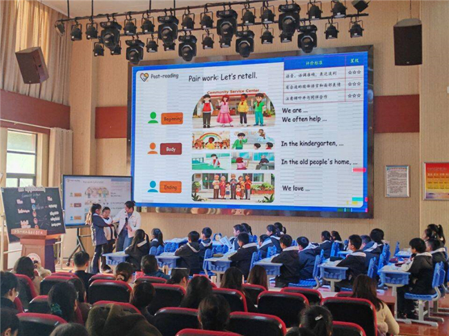 课例展示环节,园上园喻岗分校的杨杨老师执教人教PEP四年级上册Unit4 Helping in the community Part B Read and write一课。课堂上,杨老师运用AI技术,将静态的文本内容转化为生动有趣的动态视频,不仅有效激发了学生的学习兴趣,更助力学生深化对文本的理解,为后续的读后写作环节搭建起扎实有力的学习支架。