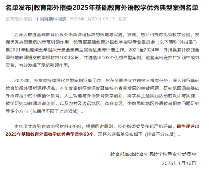 喜报:合肥一六八新店花园学校初中英语教学案例入选教育部基础教育外语教学优秀典型案例