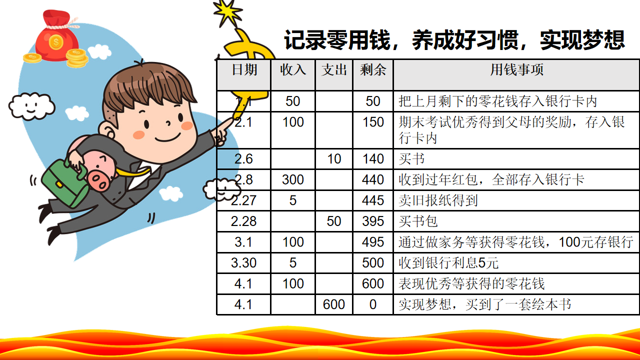 课堂上,吕庭依妈妈围绕货币篇、储蓄篇、记账篇、投资篇四大板块,将专业的金融知识转化为贴合孩子认知的趣味内容,层层递进展开讲解。在货币篇中,她从货币的由来娓娓道来,带领孩子们认识不同国家的外币,科普基础的汇率兑换知识,让孩子们领略货币背后的趣味知识;走进储蓄篇,她用通俗的语言解释储蓄的含义,告诉孩子们银行是储蓄财富的专业场所,帮大家建立对储蓄的基础认知;记账篇里,她以清晰的表格形式,示范如何记录零花钱收支,引导孩子们学会通过记账养成良好的消费习惯;讲座最后,她重点讲解理性消费的技巧,教会孩子们区分“需要的”和“想要的”,牢记货比三家,学会按计划合理使用零花钱。
