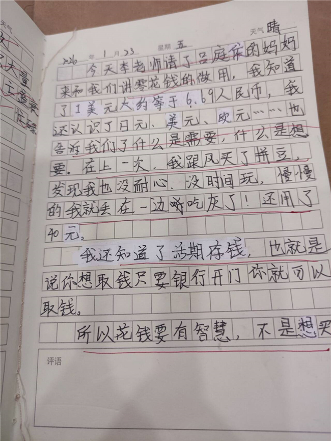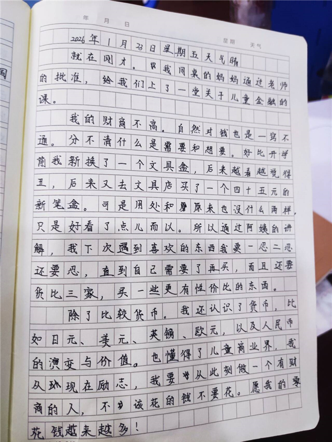 整堂讲座深入浅出、互动性强,专业的金融知识在吕庭依妈妈的讲解下变得通俗易懂。孩子们听得认真、记得仔细,纷纷主动思考零花钱的使用方式。讲座尾声,孩子们踊跃分享感悟,纷纷表示今后会合理规划零花钱,养成勤俭节约、理性消费的好习惯,让零花钱花得有意义、有价值。