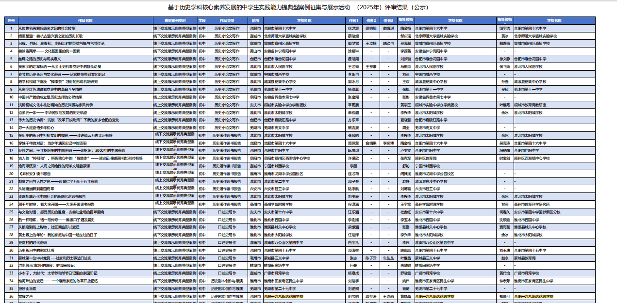 近日,安徽省教育科学研究院公布了 “基于历史学科核心素养发展的中学生实践能力提升典型案例征集与展示活动(2025 年)” 的评审结果。我校学子在本次省级赛事中凭借扎实的学科素养与出色的实践能力脱颖而出,斩获佳绩,特此向全校师生报喜!在本次活动中,合肥一六八新店花园学校共有3 项作品获奖,具体如下: