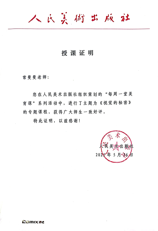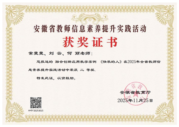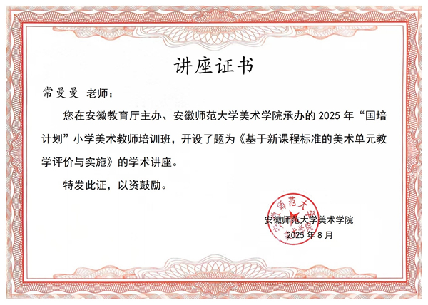 在教学中,常老师同样表现亮眼。2025年9月,她受邀参与安徽省教育厅、安徽师范大学美术学院承办的2025年“国培计划”小学美术教师培训班,做专题讲座;2025年5月,她在人民美术出版社组织的美育课例展示中,面向全国进行《视觉的秘密》专题授课,获得高度评价。同年7月,她又在教师信息素养提升实践活动中斩获省级二等奖。一系列成绩的背后,是她对课堂精益求精的追求。