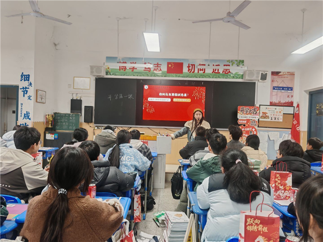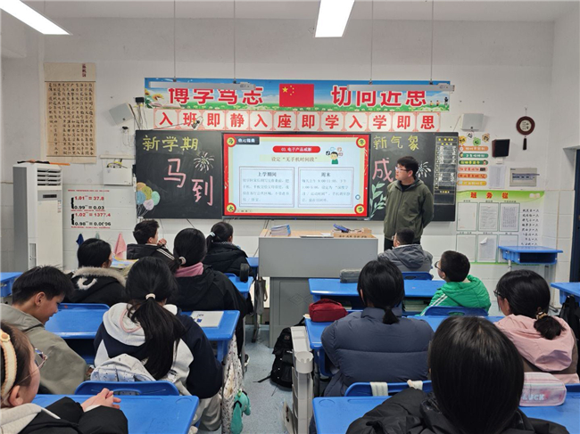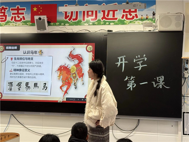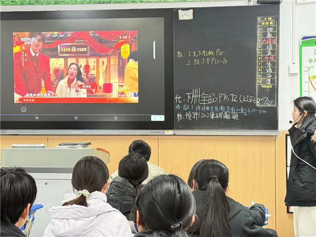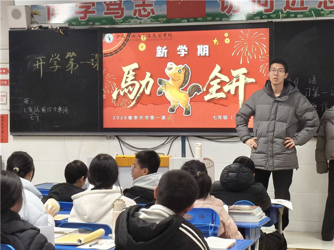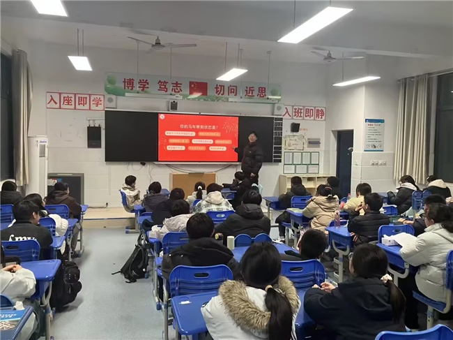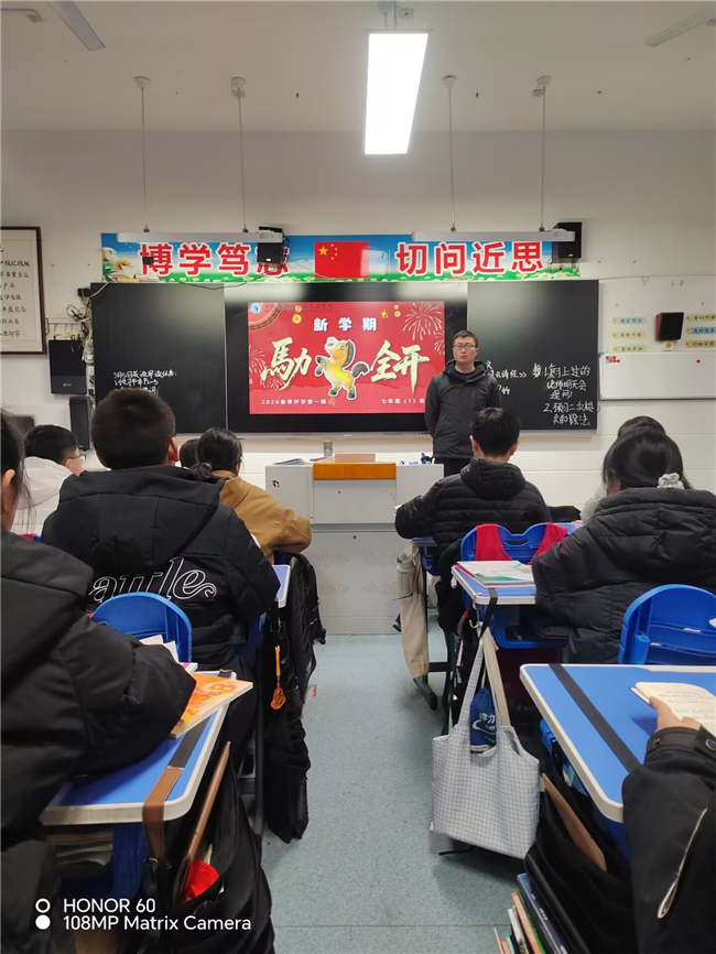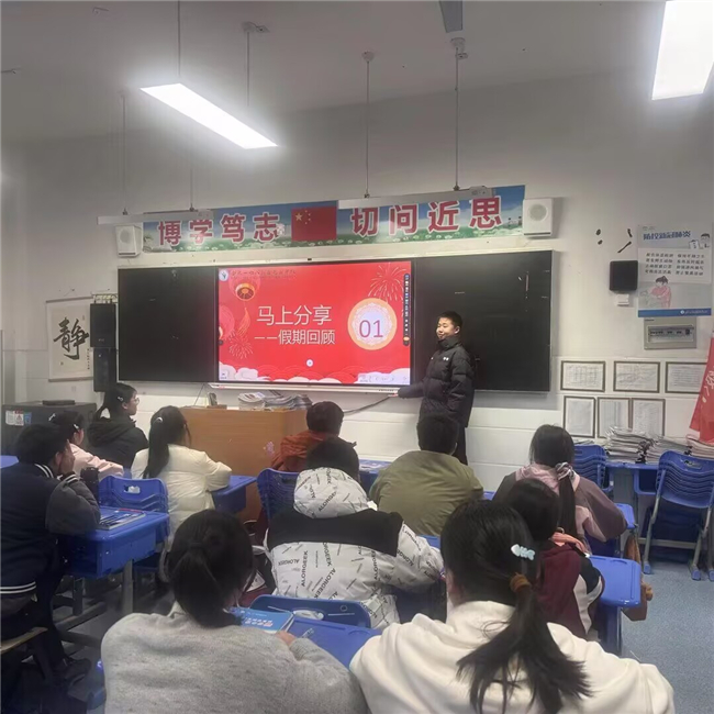 “马上分享”环节,趣忆寒假时光。班会伊始,老师们以马年趣味谜语开场,轻松点燃课堂氛围。同学们围绕寒假生活踊跃分享,从马年春晚中感受中国机器人产业飞速发展、智能养老照进现实的科技魅力,畅谈假期见闻、成长收获与生活感悟,在交流中回顾充实假期,凝聚前行力量。
