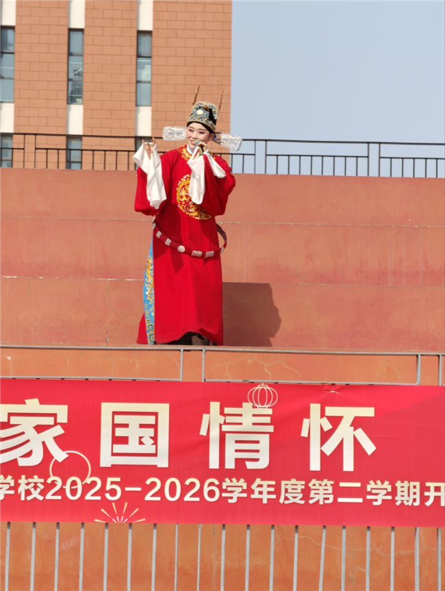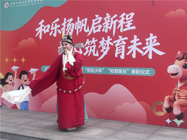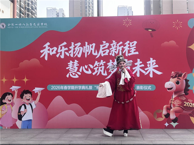 本次开学典礼特邀合肥春晚演出嘉宾、合肥市庐剧院青年演员梁静茹、王永正老师登台献艺,为中小学全体师生带来了一场精彩的戏曲文化盛宴,团委副书记吴慧洁、政教处左雅楠老师全程统筹节目秩序,保障表演顺畅推进。舞台上,梁静茹老师演绎黄梅戏《女驸马》经典选段“谁料皇榜中状元”,唱腔婉转悠扬,身段优美灵动,将经典戏曲的魅力展现得淋漓尽致;王永正老师带来庐剧《包公赶驴》中的经典选段“奉旨查访”,韵味醇厚、惟妙惟肖,让师生们沉浸式感受庐剧这一地方非遗的独特风采。如今的合肥接连登上总台春晚、元宵晚会舞台,走出古韵与科创共生的特色发展之路,此次戏曲进校园,让中小学学子近距离感受传统艺术之美,不仅激发了大家奋勇拼搏的豪情、砥砺前行的斗志,更深化了师生对中华优秀传统文化的认同,坚定了弘扬传统文化的自信,精彩的表演也赢得现场阵阵掌声,在潜移默化中提升了学生的审美素养,让传统文化的种子在孩子们心中生根发芽。