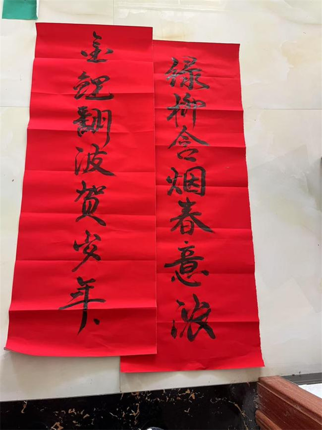 腊月二十八那天,我就铺开了红纸,研好墨。笔尖落下,墨香四溢——上联“骏马奔腾迎百福”,下联“春风浩荡纳千祥”。写春联可真不简单,既要结构工整,又要把“马”的气势写出来。收笔时,看着亲手写的“福”字,心里满满都是成就感。