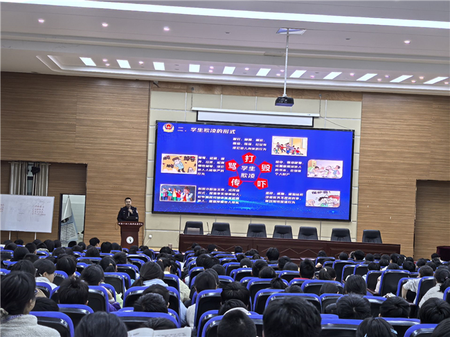 讲座现场,颜警官结合七年级学生的年龄特点和日常学习生活实际,摒弃枯燥的理论讲解,用通俗易懂的语言、贴近校园的真实案例,围绕防范校园伤害、交通安全、预防网络成瘾、远离毒品诱惑四大核心内容展开讲解。在校园欺凌防范环节,他清晰界定了欺凌行为的具体表现,细致分析了欺凌对受害者、欺凌者及校园环境的多重危害,手把手教同学们遭遇欺凌时要及时向父母、老师倾诉,拨打110、12355等求助电话,妥善保留聊天记录、伤痕照片等证据,坚决拒绝“以暴制暴”;针对不法侵害和硬物伤害,他提醒同学们不轻信陌生人、不携带危险物品进校园,遇到冲突冷静处理。