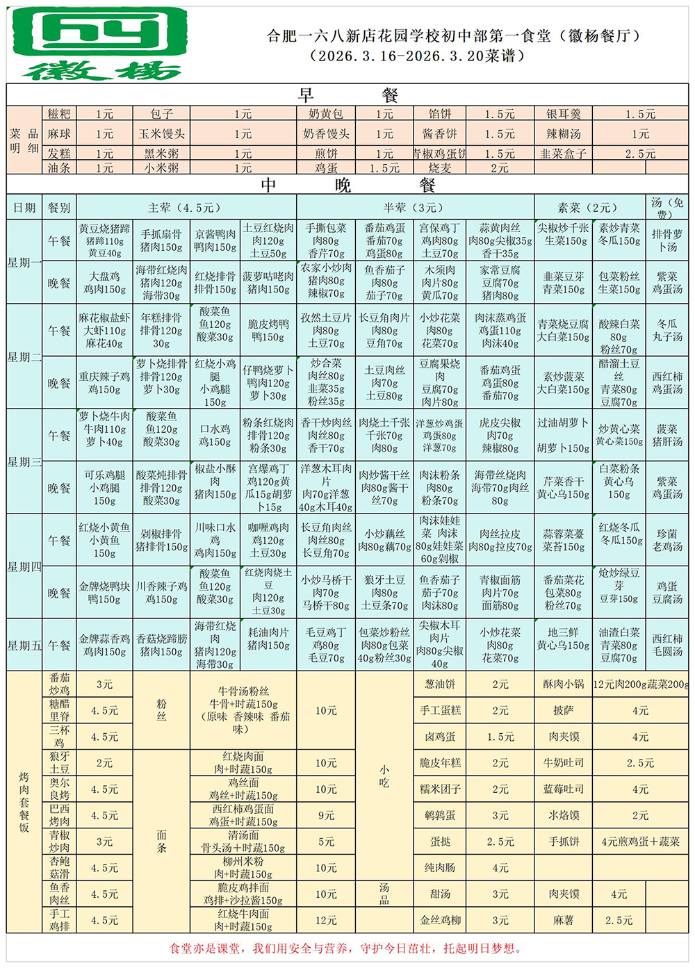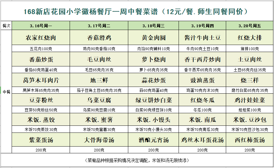 合肥一六八新店花园学校一周菜单(3月16日-3月20日)