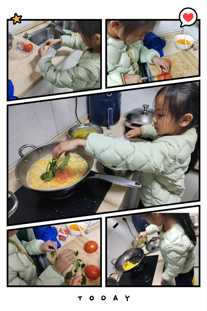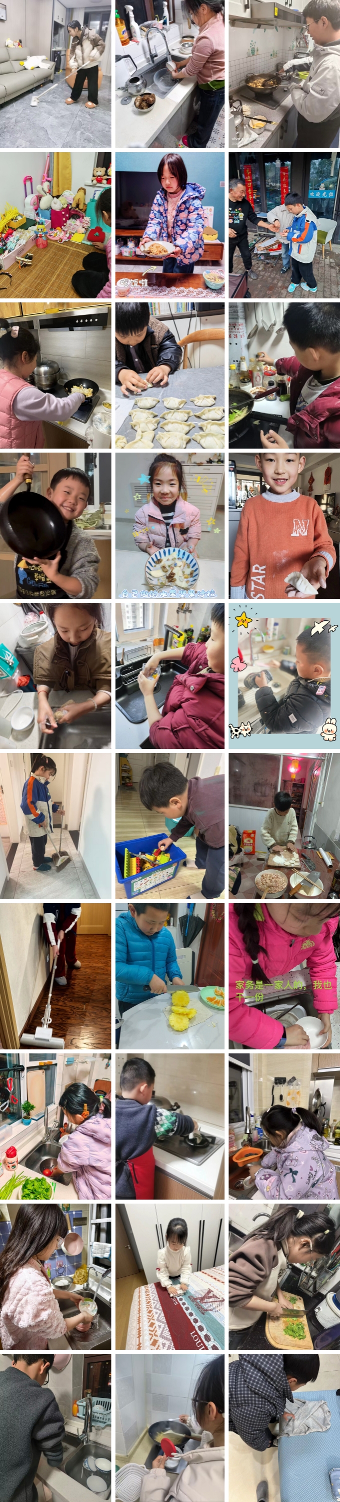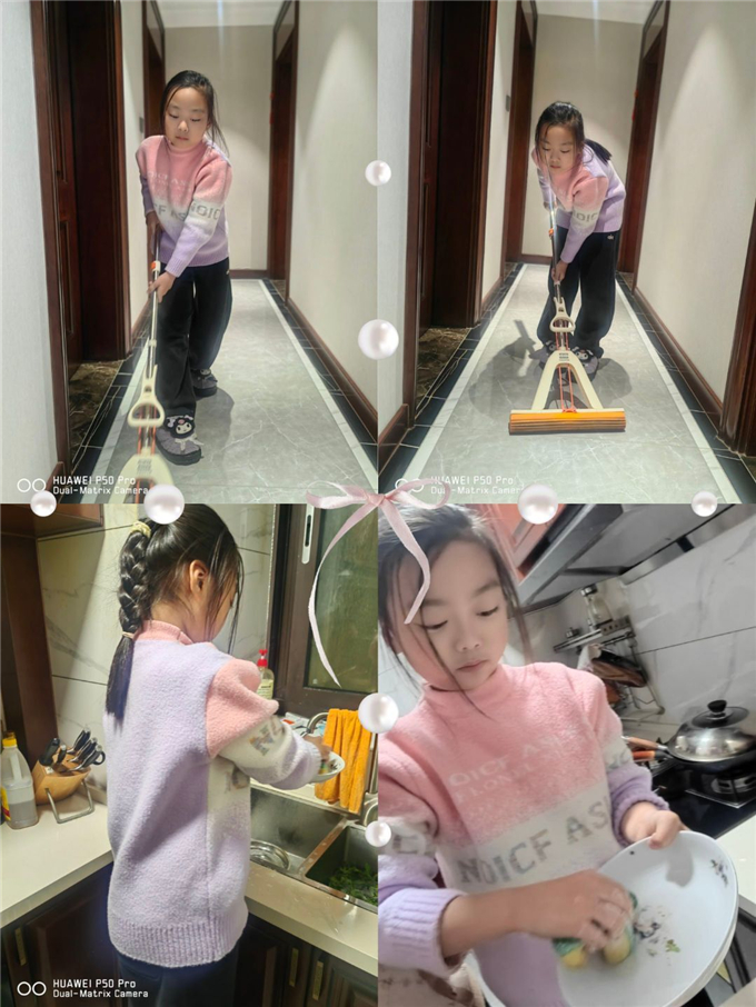 有孩子系上围裙,做出各类色香味俱全的菜系,包出的饺子也个个饱满。有孩子把碗筷刷得干干净净,连锅底都擦得反光,举起来向妈妈“邀功”。叠衣服、洗袜子、整理玩具、收拾碗筷……那些平日里“没时间做”的家务,在这一天,成了孩子们最骄傲的作品。