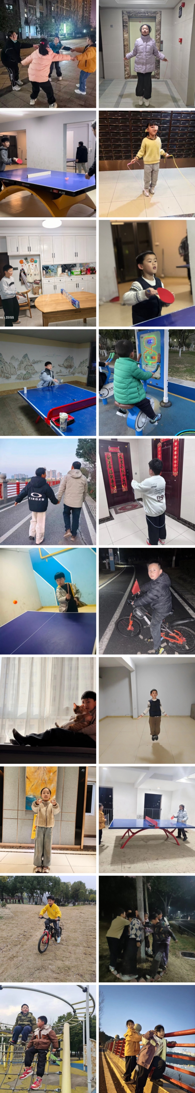 小区空地、楼下公园、地下车库、甚至只是家门口的一小片草地,都成了孩子们的运动场。羽毛球在空中划出弧线,乒乓球在桌案上跳跃,跳绳甩得呼呼作响。有孩子和家长一起夜骑,晚风把笑声送得很远;有孩子约上好朋友在公园里“探险”,还有孩子在家里搭起“乒乓球台”,打得热火朝天。
