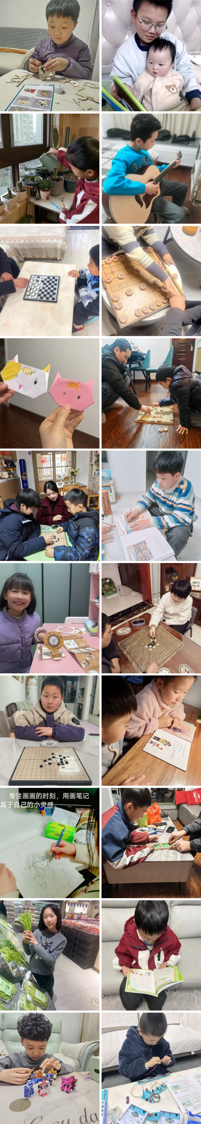 有孩子为一排排绿植浇水;有孩子给鹦鹉添食、换水,还有孩子和小猫玩耍,度过快乐时光。棋盘上,五子棋黑白交错,象棋楚河汉界;茶几上,立体拼图一块块合拢,电路板上的小灯泡“啪”地亮起。还有孩子埋头做手工,剪剪贴贴。那些“为什么”,是好奇的种子,正在发芽。