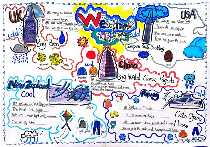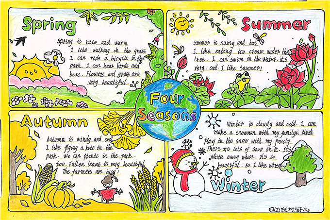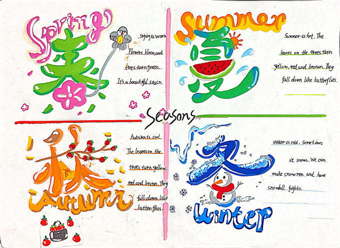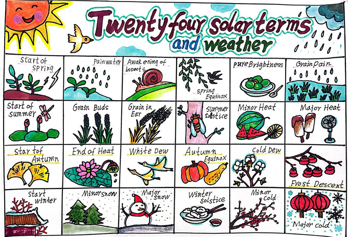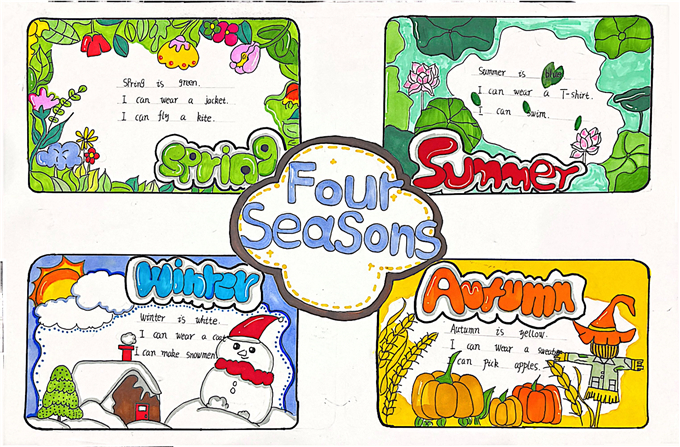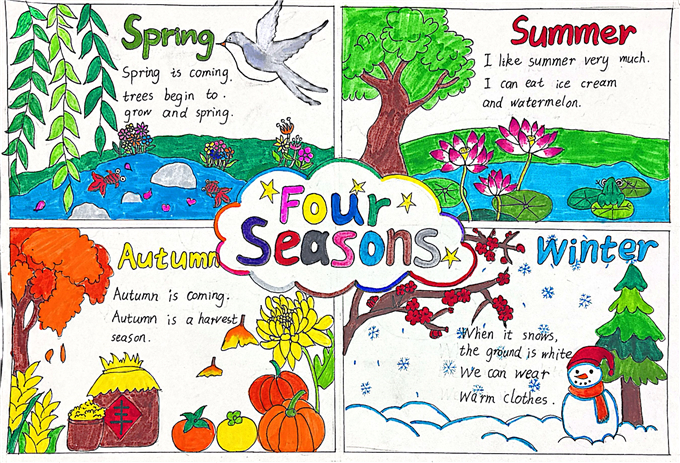 在 “巧手绘天地” 环节,同学们围绕季节与天气主题,发挥绘画与创意才能,精心绘制英语主题海报。“Four Seasons” 四季海报:用嫩绿画春天、粉荷画夏天、金黄绘秋天、白雪饰冬天,搭配英文句子生动介绍四季特点,画面清新、内容清晰。“Weather report” 天气主题海报:将 sunny、rainy、cloudy、snowy 等天气单词与可爱图标结合,图文对应、一目了然,设计美观。“Twenty-four solar terms” 节气创意海报:把中国传统二十四节气与英语知识结合,主题鲜明、文化味十足。一张张海报不仅直观呈现了季节更替与天气变化,更让英语知识变得生动可感,充分锻炼了学生的动手能力、审美能力与英语表达能力。