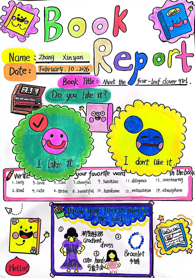 阅读是成长的基石,“悦读伴成长” 活动引领同学们走进英语绘本世界。假期里,同学们认真品读优质英语绘本,用心完成读书报告。从摘抄重点词汇、梳理故事内容,到分享阅读感悟、绘制精美插图,每一份报告都凝聚着阅读的收获。通过绘本品读,孩子们拓宽了英语视野,培养了阅读习惯,在趣味故事中提升了英语理解与书面表达能力。