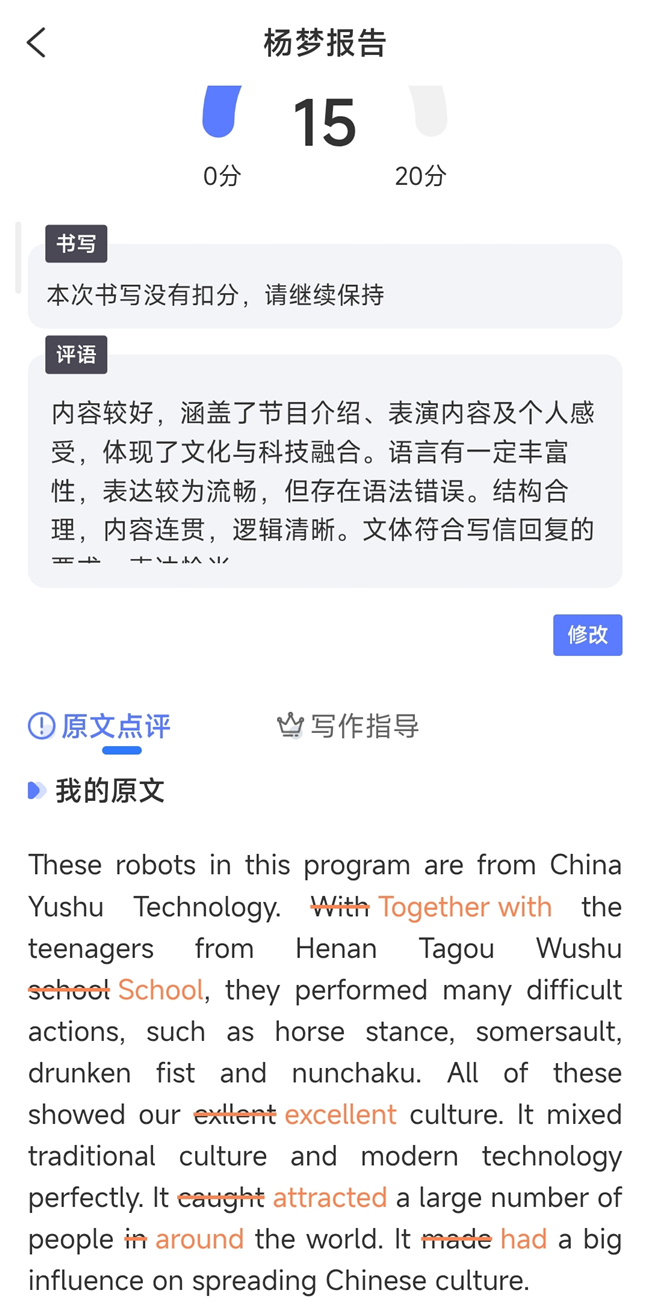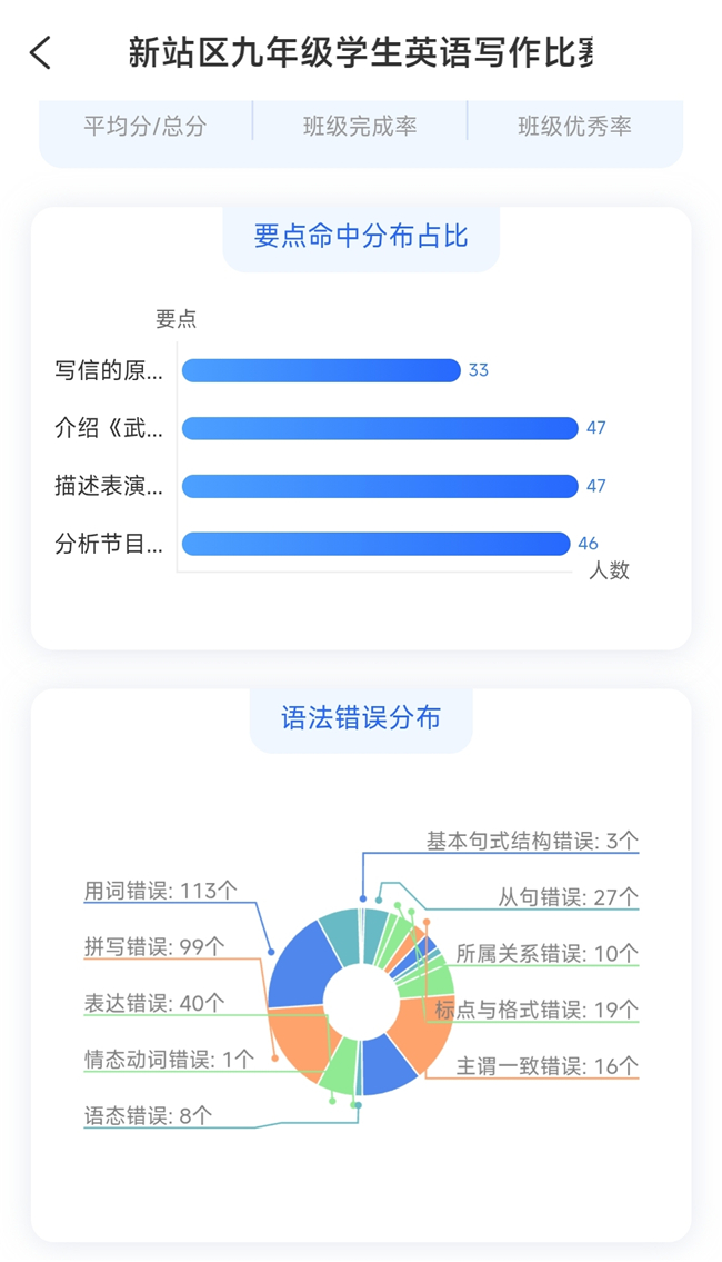 除智能评分外,该系统还具备强大的学情分析与个性化点评功能。一方面,系统可自动汇总班级学生写作共性问题,对语法错误、句式短板、逻辑疏漏等问题进行系统化归纳,帮助教师快速定位教学薄弱环节,制定靶向性讲解方案,让作文讲评课更有侧重点、更具实效性。另一方面,系统针对每位学生的个性化错误逐一批注、修改并给出专业点评,精准匹配学生学习需求,实现“一人一策”的个性化辅导,帮助学生清晰知晓自身短板,高效修正错误、提升写作水平。