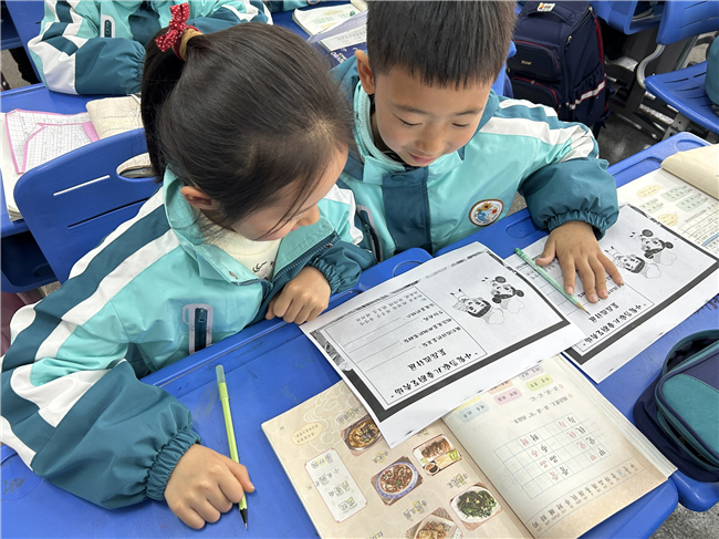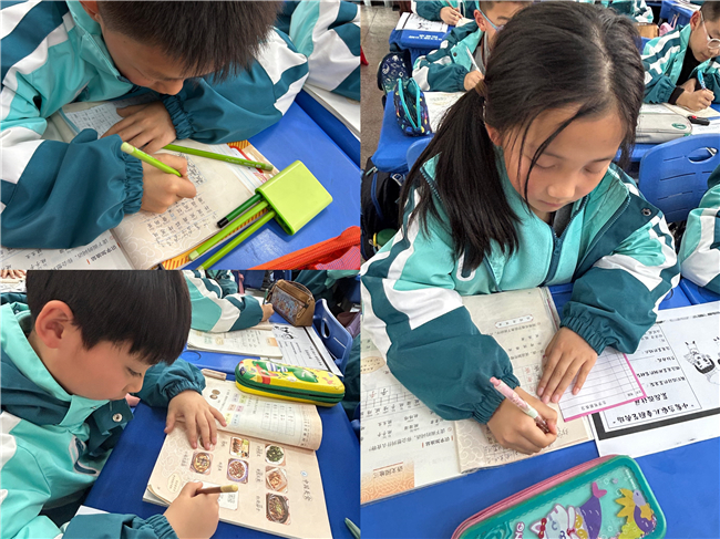 “任务一:字正腔圆报菜名” 环节,崔静怡引导孩子们借助拼音,流利地读出各种菜名,更鼓励大家合理搭配点餐,在语言实践中夯实识字基础;“任务二:分门别类选食材” 里,孩子们循着草字头的蛛丝马迹,辨认食材名称,发现形声字的构字规律,当 “肉”“腐”“酱” 等字以古字画的形式出现,孩子们在猜字游戏中拉近了与传统文化的距离;“任务三:煎炸蒸煮学烹饪” 是课堂的点睛之笔,崔静怡让孩子们圈画汉字、分类梳理,通过视频讲解揭秘 “火字旁” 与 “四点底” 的渊源 ——“小火苗会变身,在侧为火旁,在下为四点底”,生动的表述让汉字学习变得妙趣横生,孩子们在书写 “烤” 字时,眼神里满是对汉字的喜爱;“任务四:大显身手制全席” 中,孩子们拿起学习任务单,发挥想象创造特色菜肴,一张张充满童趣的 “创意菜单”,不仅展现了语言表达能力,更藏着对生活的热爱与对文化的感悟。整堂课上,崔静怡以文化为线、以任务为轴,将识字、写字、表达与文化传承融为一体,课堂氛围活跃而有序,孩子们在 “品美食、学汉字、悟文化” 的过程中,感受到了语文学习的独特魅力。