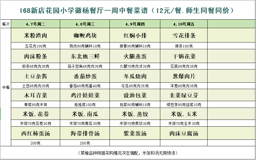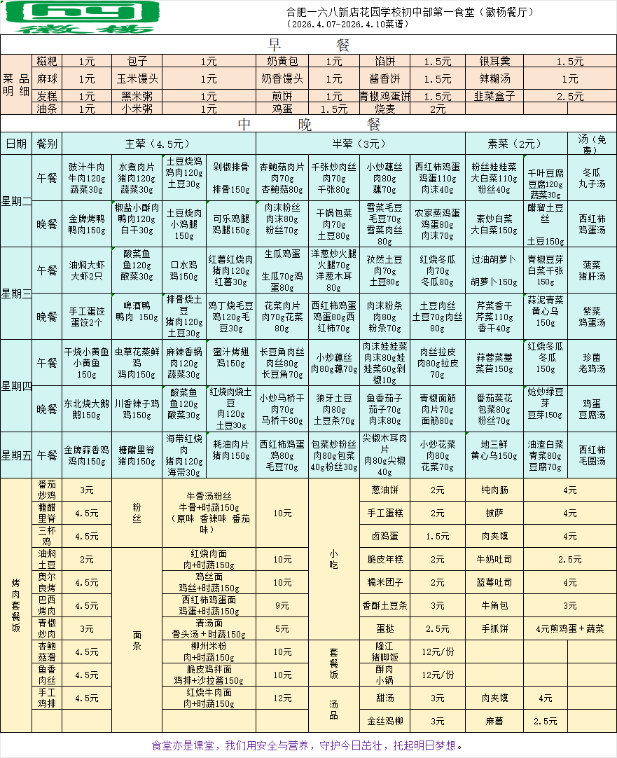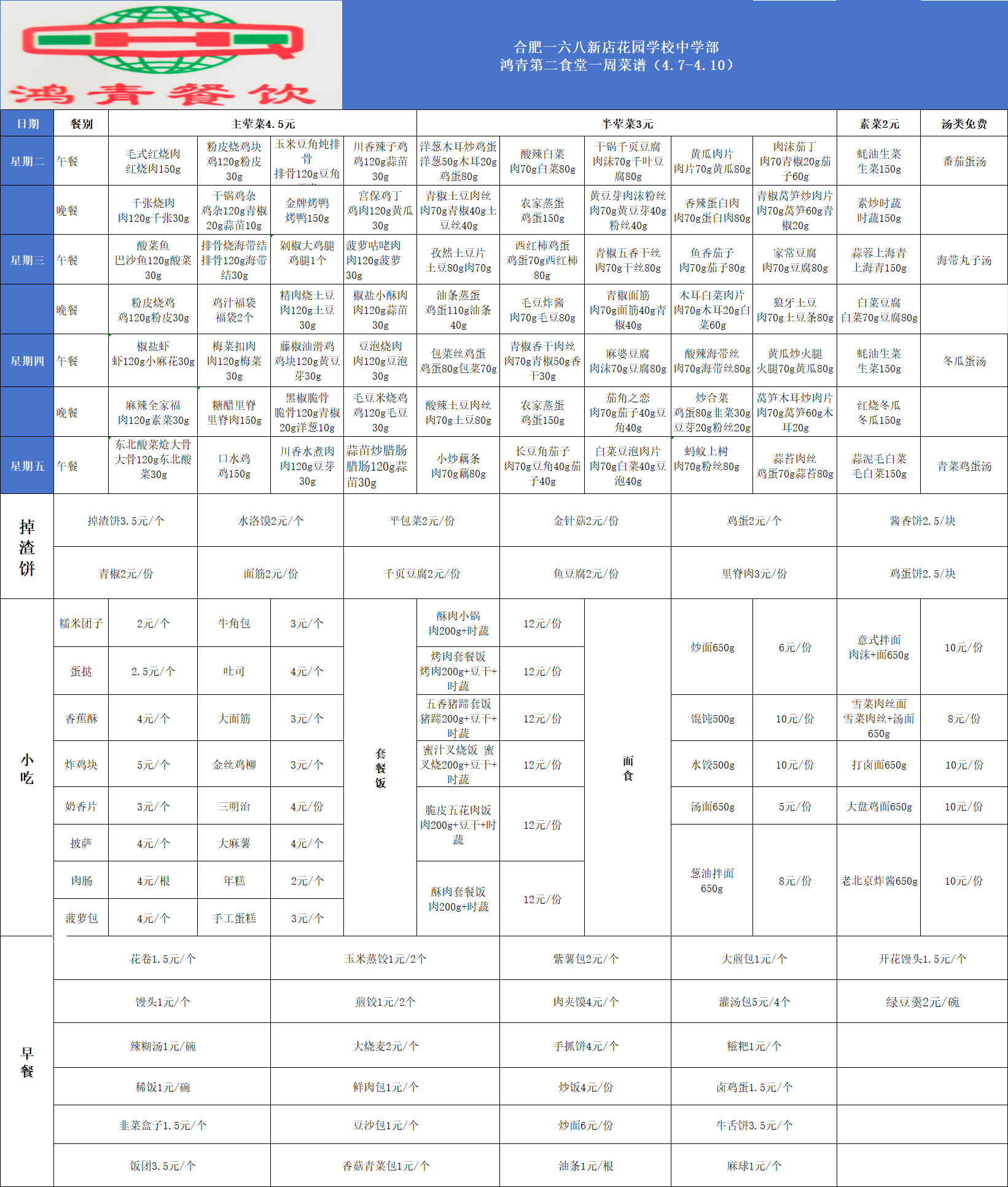 合肥一六八新店花园学校一周菜单(4月7日-4月10日)