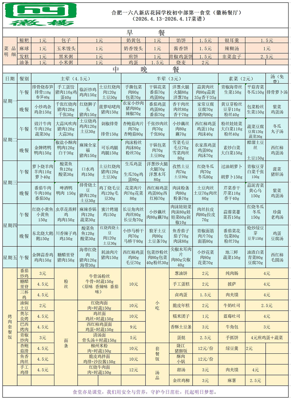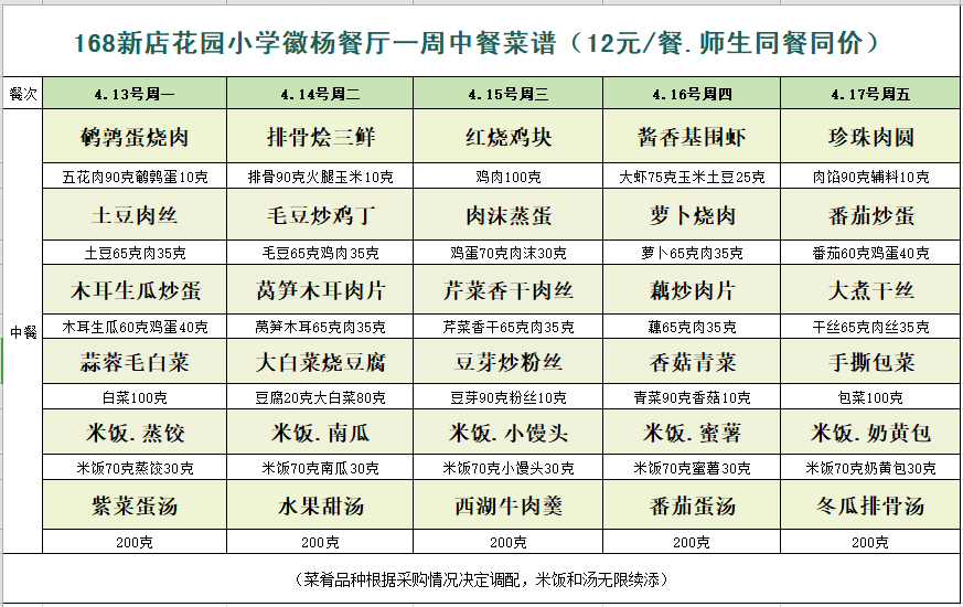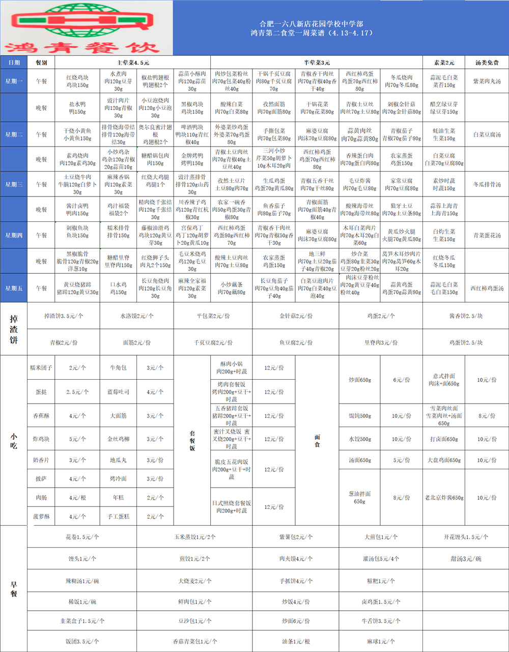 合肥一六八新店花园学校一周菜单(4月13日-4月17日)