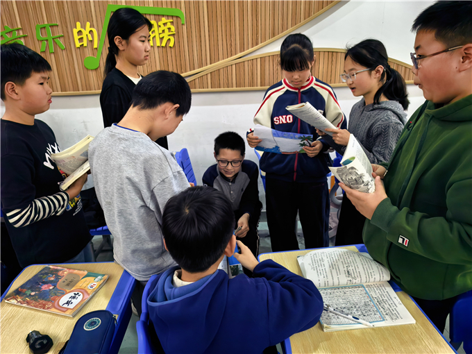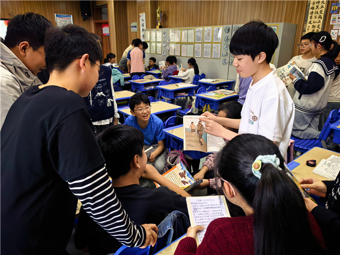 课堂上,同学们以小组为单位,围绕阅读感受、疑难问题、收获体会与深度思考展开热烈交流。大家各抒己见,畅谈主人公鲁滨逊在荒岛上不畏艰险、乐观向上、顽强生存的精神品质,分享阅读带来的心灵触动。
