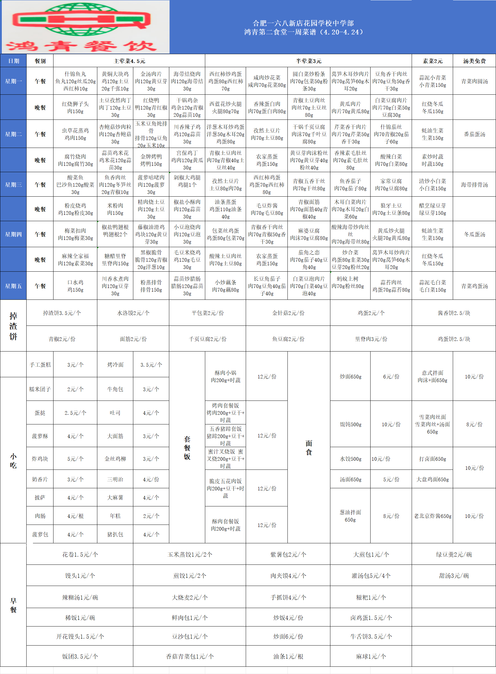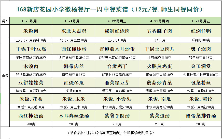 合肥一六八新店花园学校一周菜单(4月20日-4月24日)