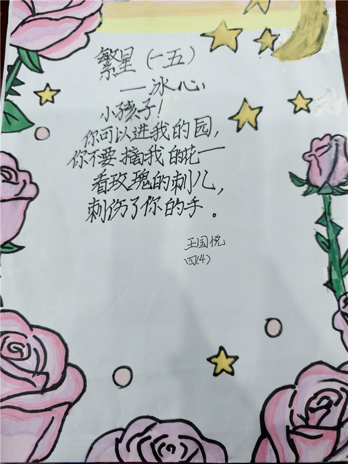 一本本自制诗集逐一展示,《竹梦诗集》《银河诗集》《我们的诗集》等作品格外亮眼。诗集中,既有流传千古的经典诗作,也有充满童趣的原创小诗,字里行间洋溢着少年朝气,传递着对文学、对生活的热爱。同学们相互欣赏、交流分享,在品读诗集的过程中,进一步感受文字之美、诗歌之韵,共享文学带来的快乐。结合本次诗集制作的优秀表现,经评选,傅惜文、杨雨昕、李雨轩三位同学荣获“书香少年”称号,以表彰他们在活动中展现出的良好阅读素养与出色创作能力,为同学们树立了良好榜样。