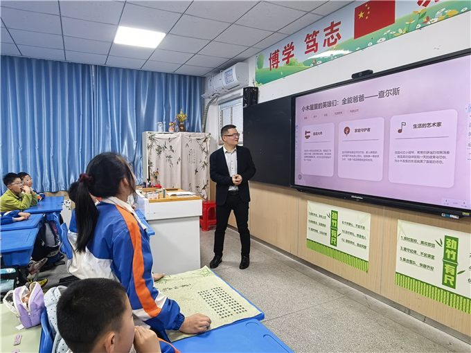 课堂上,黄清池爸爸准备充分、讲述温情,借助精心制作的PPT,将百年前的西部草原呈现在孩子们眼前。他用生动的语言,讲述了拓荒女孩劳拉一家告别家乡、远赴草原、搭建木屋、直面挑战的动人故事,从抵御狼群、抗击疾病,到邻里相助、友好交往,一个个鲜活片段深深吸引着在场每一位同学。他还细致介绍了作者罗兰·英格斯·怀德的传奇经历,让孩子们在了解创作背景的同时,感受文字背后的真实与温暖。
