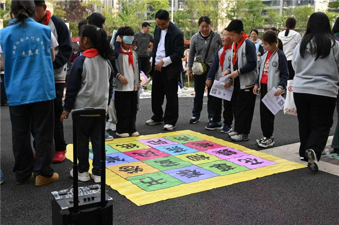 最受孩子们欢迎的是集章打卡互动区。“诗词跳跳乐” 游戏里,同学们跳跃在印有经典古诗词的彩色垫上,准确背诵诗句、顺利通关,让传统文化在趣味运动中入脑入心;“常识飞行棋” 将生活常识、阅读知识、科普要点融入棋局,大家在博弈中学习知识、收获快乐。完成各项游戏打卡后,同学们还收获了精美卡通书签,在欢声笑语中完成了一场充实的文化之旅。