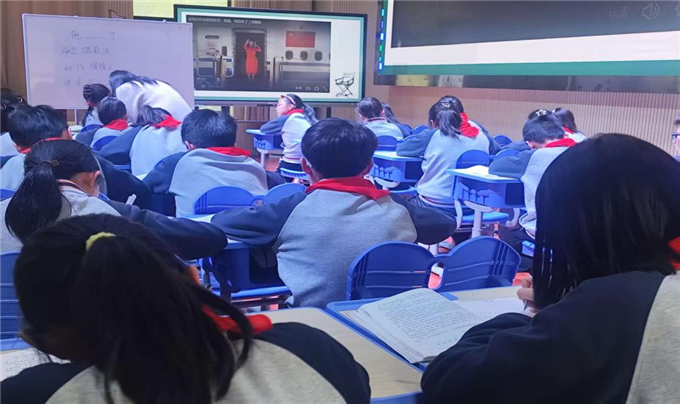 活动伊始,两节高质量习作示范课精彩呈现。李维维执教五年级下册第四单元习作《他____了》,课堂紧扣“观察人物、体悟内心”的教学重点,通过“孟晚舟回家哽咽发言”视频,引导学生捕捉动作、神态、语言等细节,层层搭建表达支架,让学生在情境感知与片段练笔中,掌握把人物状态写具体、写生动的方法 。课堂氛围轻松活跃,学生积极参与,在交流与创作中感受细节描写的魅力。
