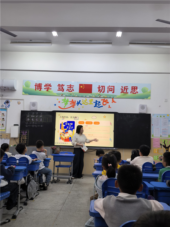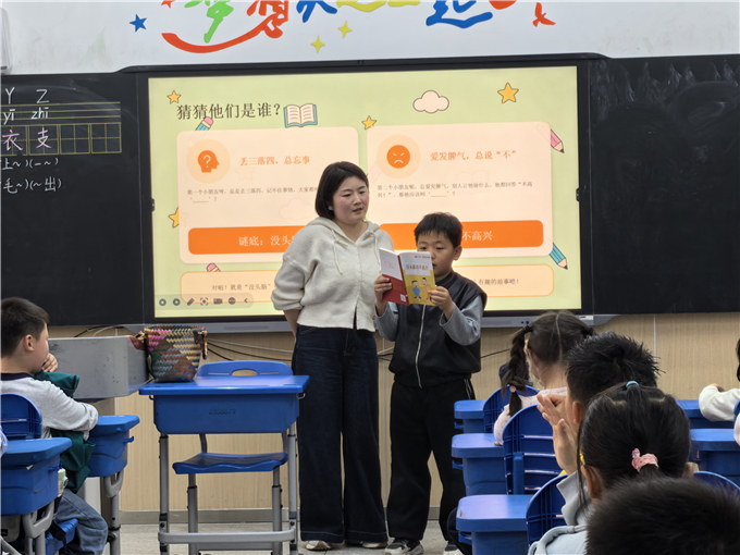 随后,孩子们在轻松愉快的氛围中开启了故事探索之旅。部分同学勇敢登台,朗读书中的精彩片段;在互动环节中,孩子们参与热情高涨,在欢声笑语中加深了对人物性格的理解。方艺锦妈妈还通过“没头脑的超级大工程”“不高兴的没完没了表演”等趣味话题,引导孩子们分析角色特点:没头脑的迷糊粗心、不高兴的固执任性,都在讨论中变得鲜活立体。