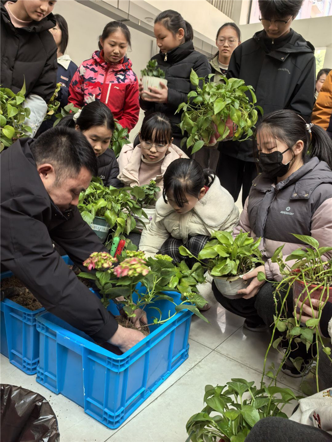 理论课后,生活区老师带领同学们来到现场,手把手指导培土、施肥、换盆等技巧。大家围在绿植旁,认真观察、动手实践,从小心翼翼地修剪黄叶,到仔细地为绿萝添土浇水,每一个动作都透着对生命的珍视。